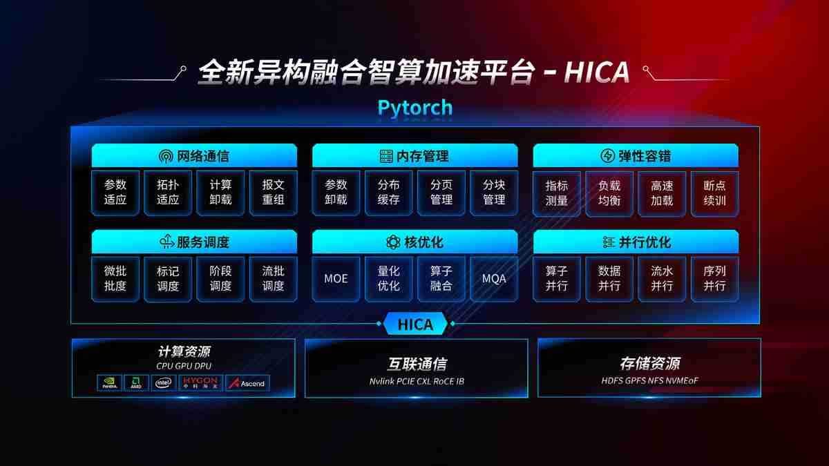 通过自研的服务层、、中间适配层、、、、以及调度编排算法,,采用数据并行、、、模型并行等多种并行方式,,,,把并行计算任务进行有效的分解,,,,使其分别由相应的软件栈和算力资源来承接。。。。当GPU资源变化,,,,HICA可以实时动态调度计算子任务并调整模型拓扑和架构,,,以充分聚合各种算力资源。。。