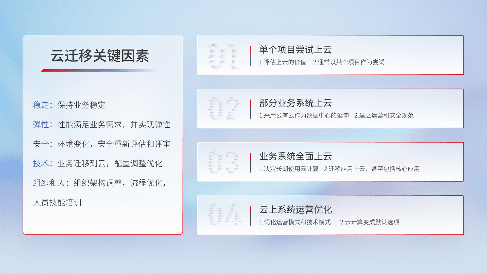 结合实际业务,,,从规划设计、、、云平台选型、、、、云原生改造、、、、数据迁移、、、集成交付,,,,迁移全过程为客户识别最佳上云路径,,,做好风险识别管理,,设计网络架构、、、身份权限、、安全审计合规、、、、操作审计、、日志审计、、、监控告警策略、、、、多站点容灾设计等,,对云上基础设施进行整体规划,,提升IT治理水平,,,以满足弹性、、、高可用、、高性能的需求。。。