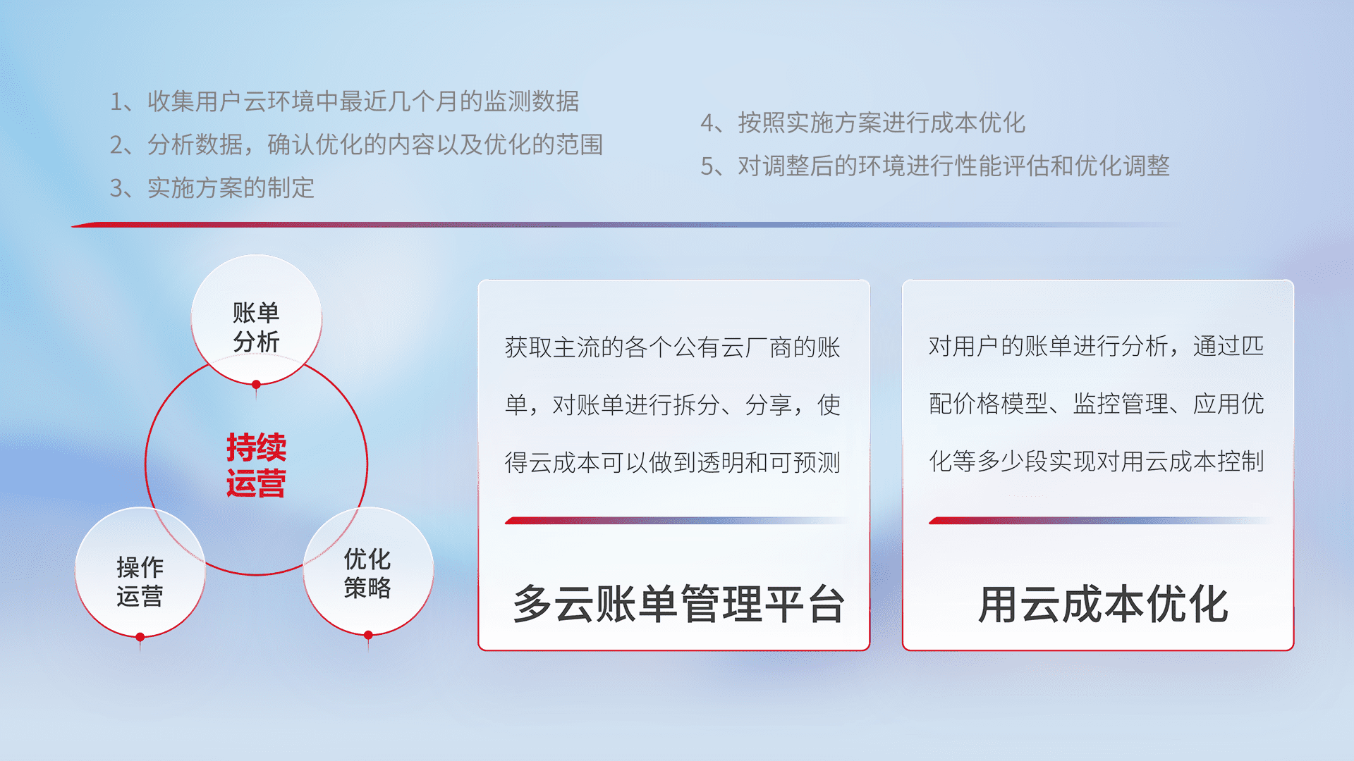 通过多云纳管,,以统一的资源数据模型把客户的云资源进行抽象和封装,,进而实现对多云资源的统一操作,,,,保障云资源管理的可靠性、、、稳定性与可用性。。。量身定制化运维内容,,,配置、、开发运维、、、补丁管理、、备份、、、监控、、认证和访问管理、、、审计和日常巡检等,,,保障在用云过程中的可靠度,,稳定度以及高可用率。。。